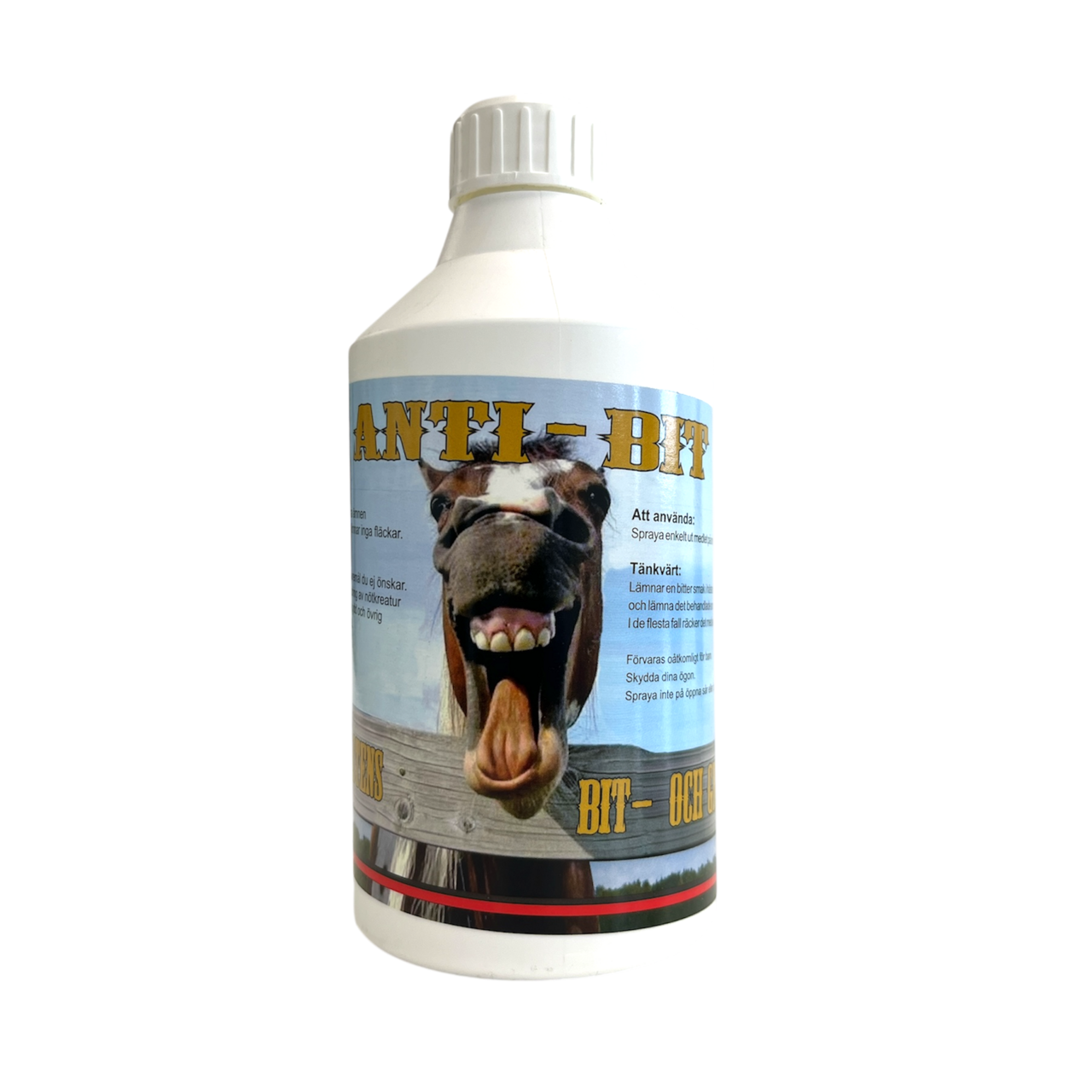 Ett spraymedel med bitter smak. Effektivt mot gnag och bitskador. Fungerar bra på täcke, svanskydd, benlindor, krubbor och stallutrustning. Kan även användas på trä, gummi och annat material. Lämnar inga fläckar och är helt fritt från gifter. Innehåller ett av de allra bistra ämnen på marknaden idag och är helt ofarligt för hästen. Pump ingår ej.