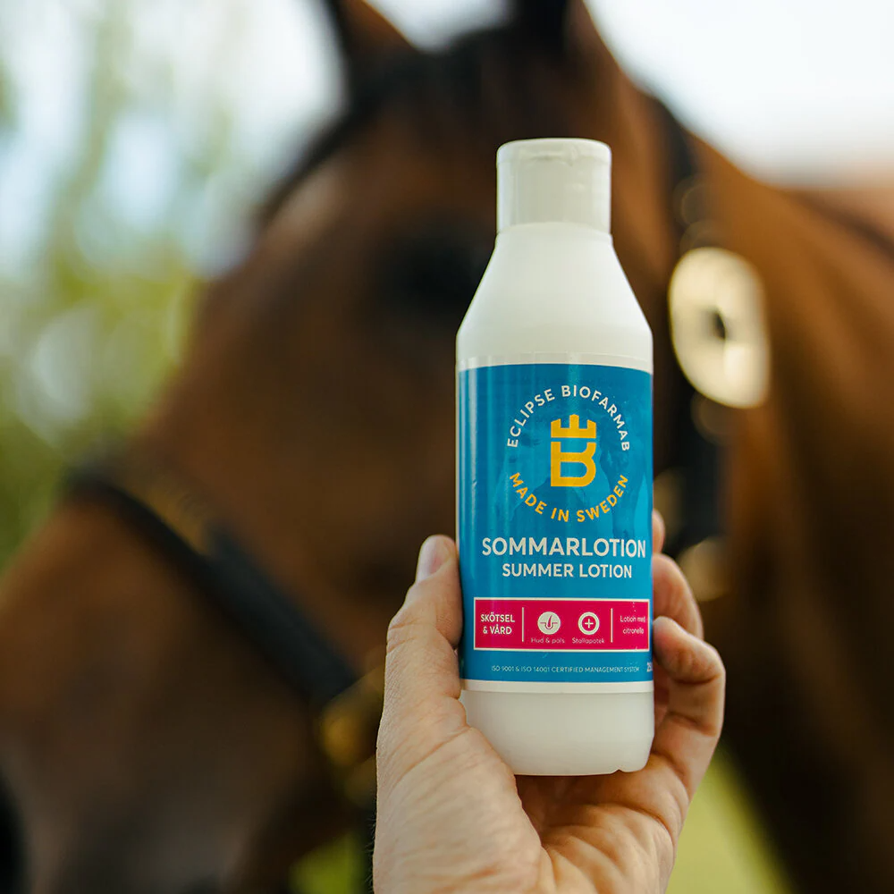 En sommarlotion med frisk doft av citronella för sommarsäsongen. Lättapplicerad och vårdande speciellt framtagen för att att kamouflera hästens naturliga doft och på så vis hålla sommarplågorna på avstånd. Formulan är skonsam nog att användas på hästens huvud. Dess lättabsorberande konsistens säkerställer att lotionen snabbt tränger in i huden utan att lämna några klibbiga eller feta rester, vilket gör den bekväm för hästen och effektiv i användningen. Undvik applikation på/vid ögon, slemhinnor och öppna sår.