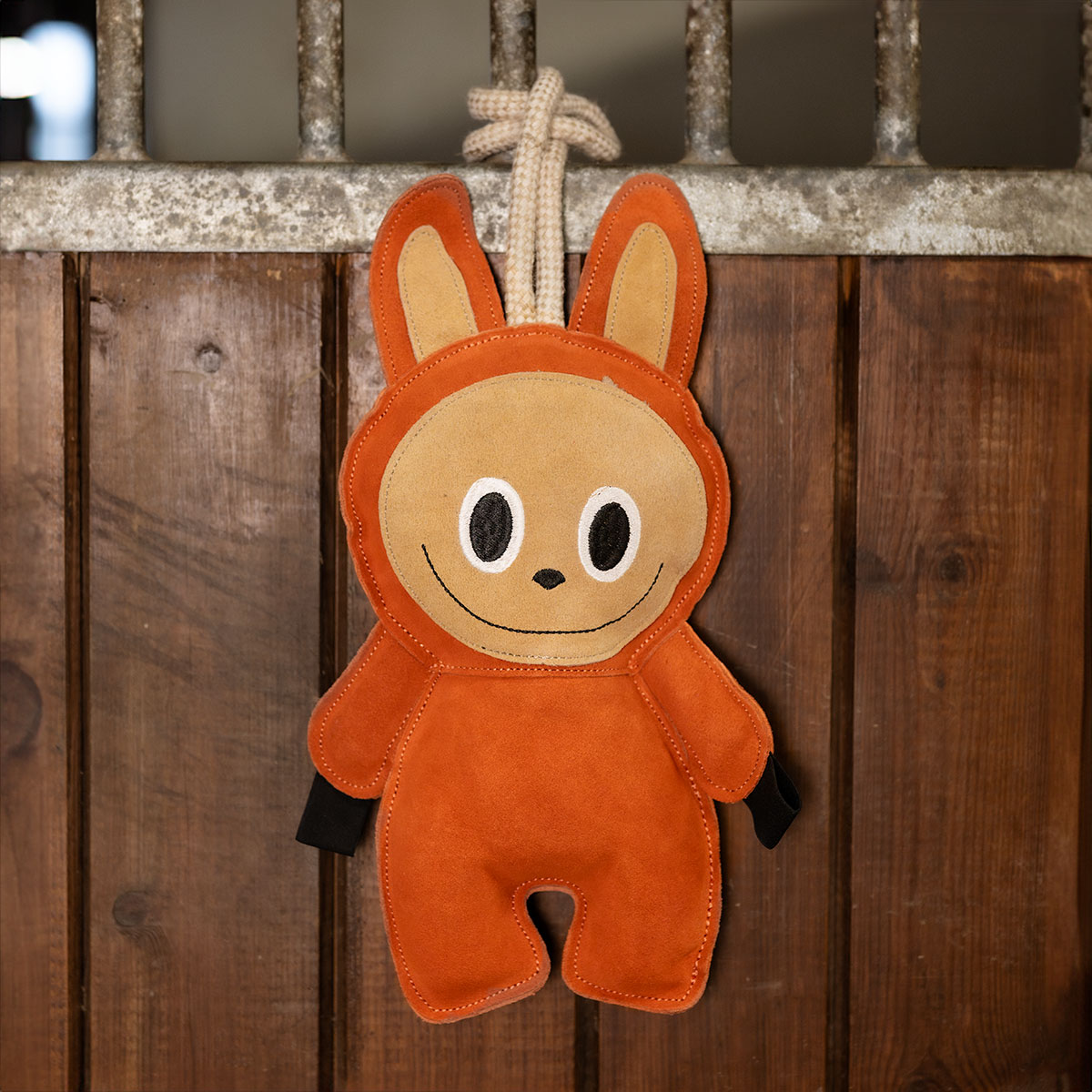 Hästleksak i mocka, perfekt för både funktion och dekoration. Utrustad med ett kraftigt rep för enkel upphängning samt resåröglor vid händerna – idealiska för att fästa exempelvis morötter eller andra godsaker.