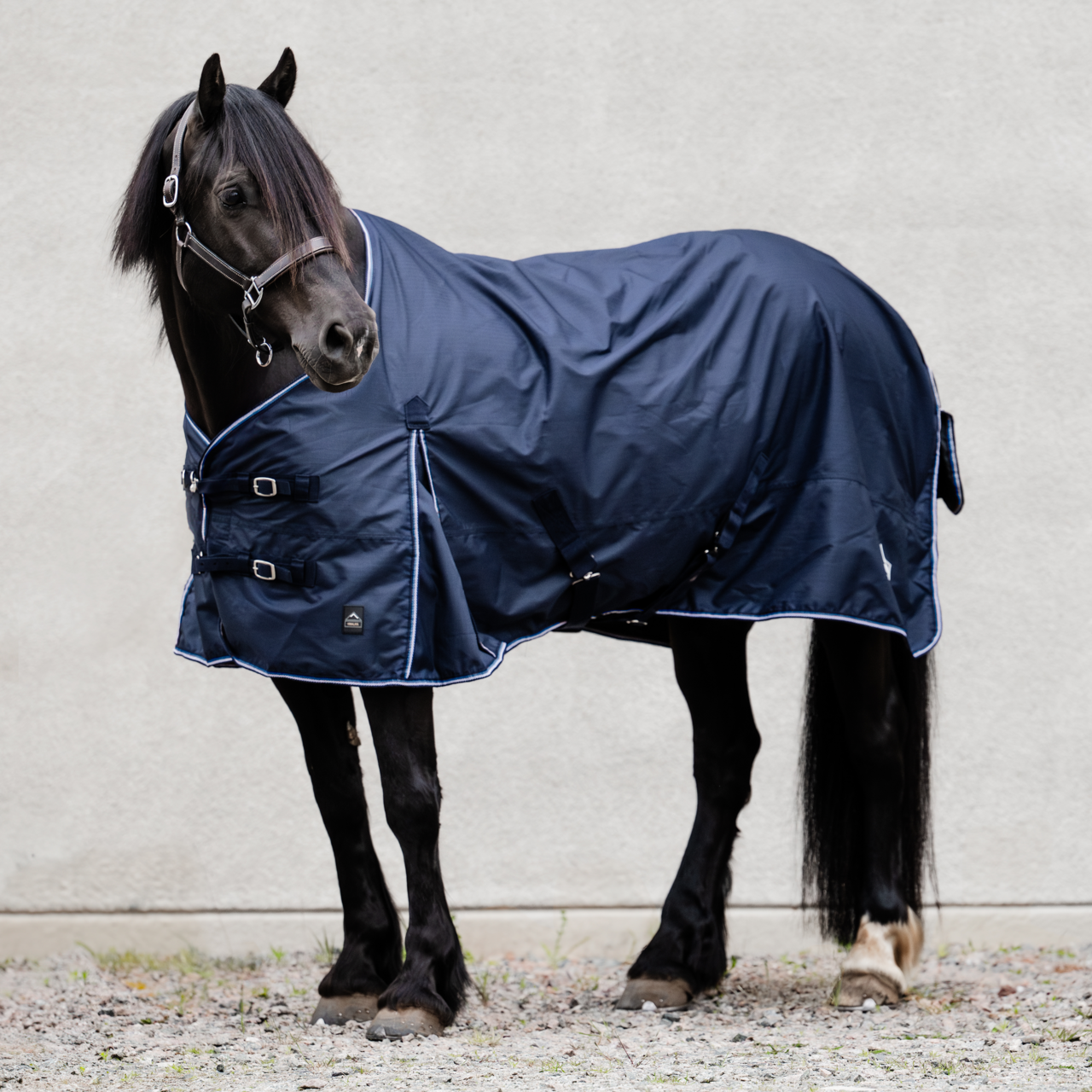 Utetäcke med 100 g fyllning. 600D polyester ripstop. Vattentätt med vattenpelare 3000 mm och andningsfunktion 3000 mvt. Täcket har två bogspännen med snabbknäppe, kryssgjordar under magen samt elastiska bensnöre och svansrem.