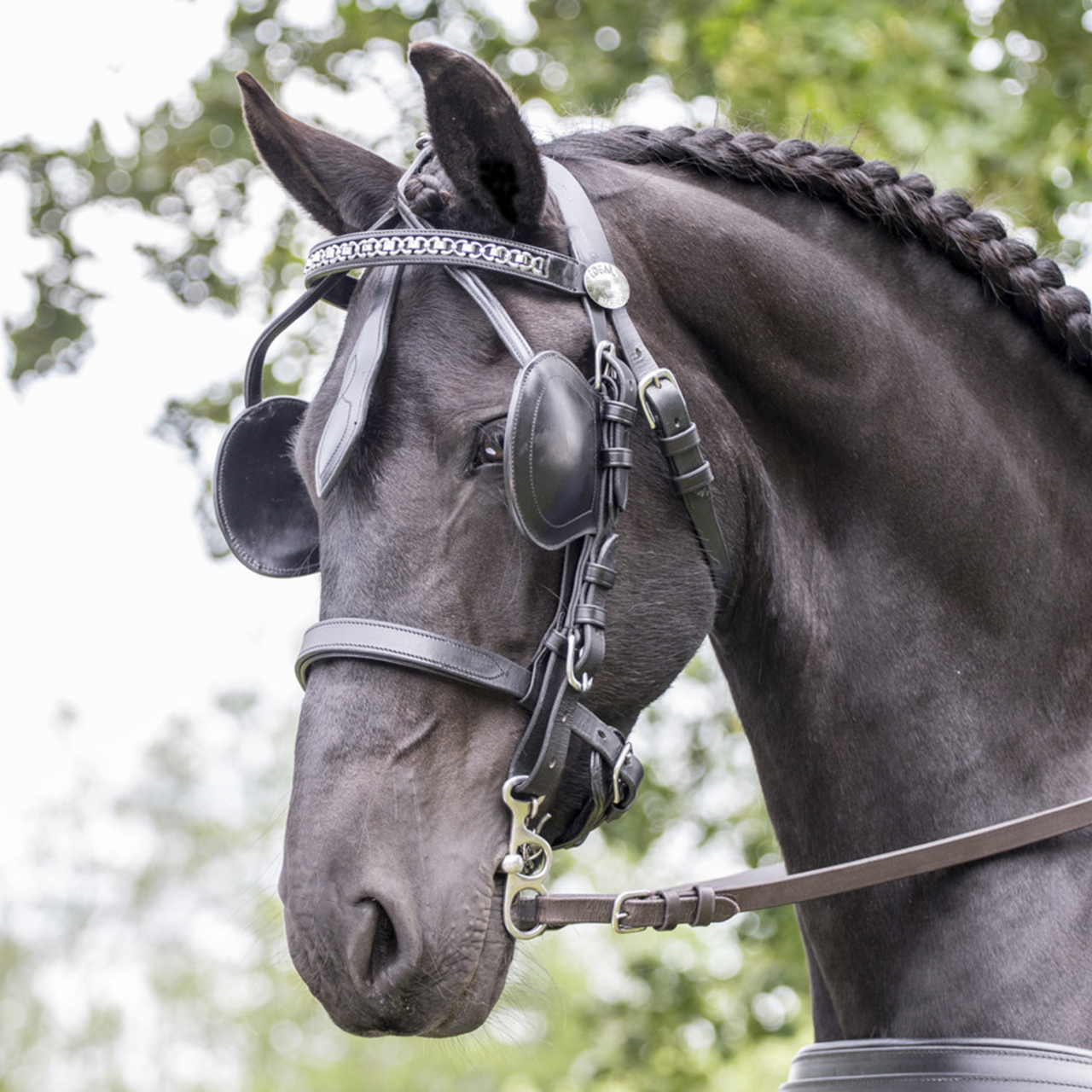 Med metallförstärkta skyggläder. Ställbar nosrem i höjdled. Pannband till storlek Ard/Sh saknar kedja, är endast i läder.