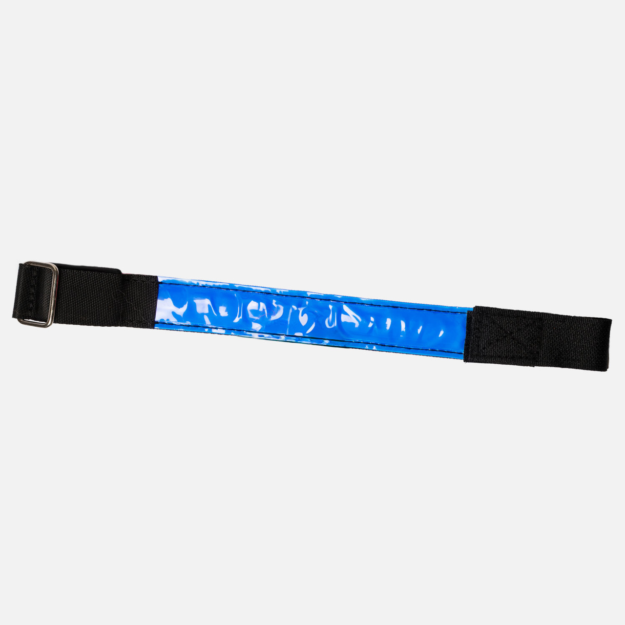 Kardborreband med LED-ljus. Laddas med USB. Kan fästa på t.ex. halsband, grimma för extra synlighet. Fungerar runt benskydd.