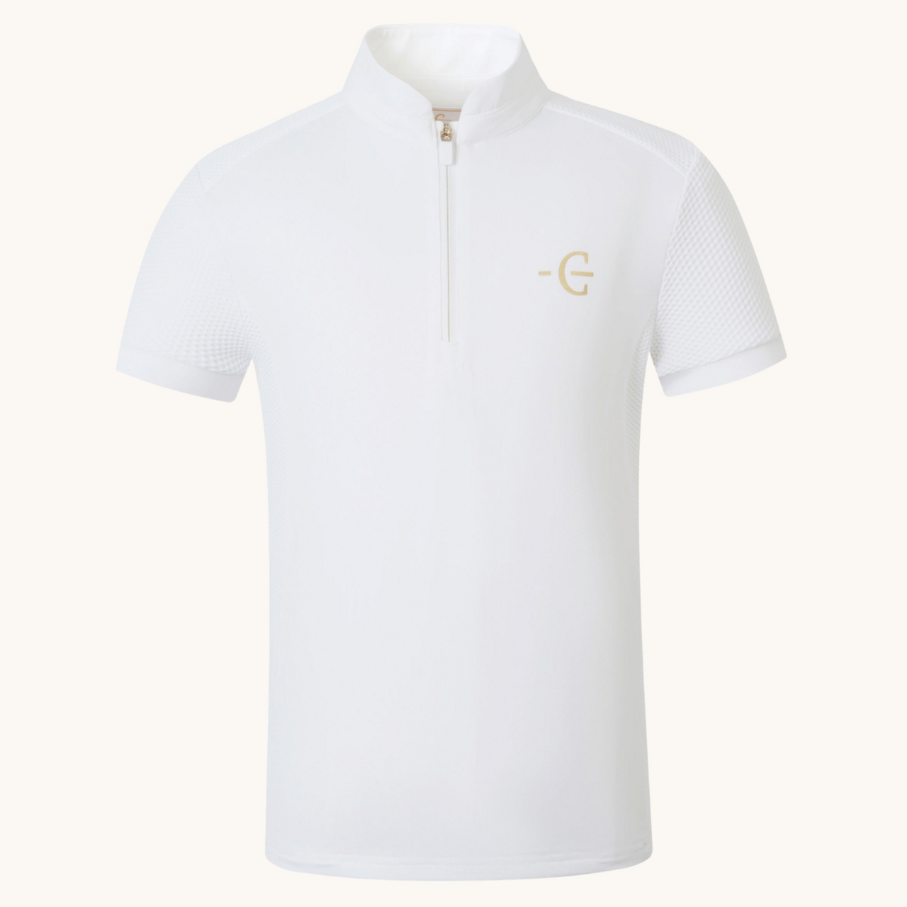 Tävlingstopp med ståkrage med “self-lock”-dragkedja och tryckknapp. Utrustad med optimerad fuktreglering, andningsaktiv och lätt kvalitet. Dekorerad med diskret glitterapplikation på kragen.